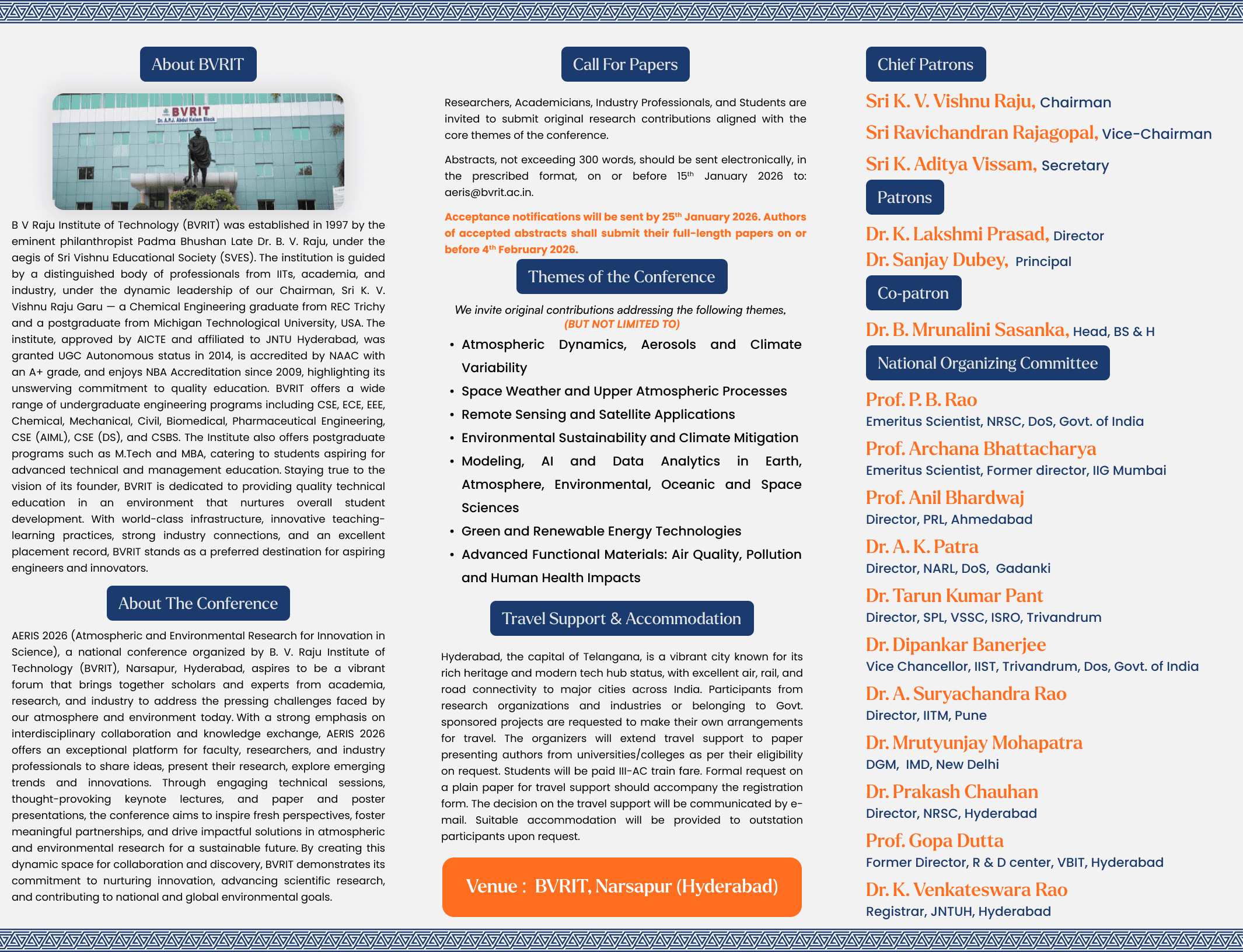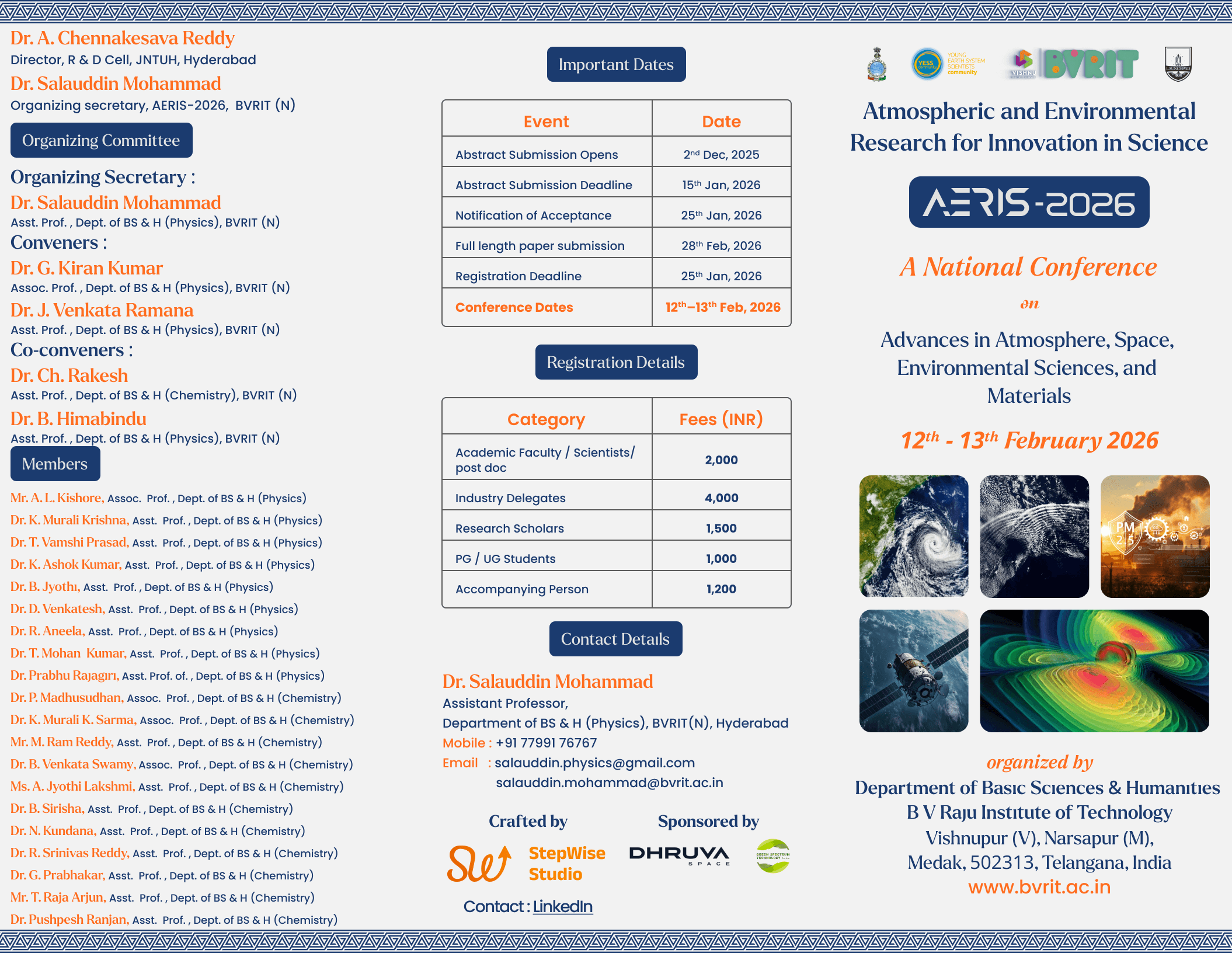 Welcome to AERIS 2026, a premier national conference dedicated to advancing knowledge and innovation in the fields of Atmosphere, Space, and Environmental Sciences. This two-day event will bring together leading scientists, researchers, academicians, industry experts, and young scholars to exchange ideas, showcase cutting-edge research, and explore sustainable solutions for a better future.